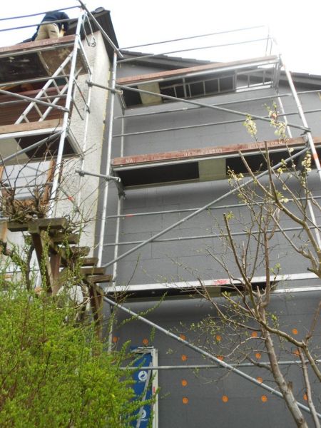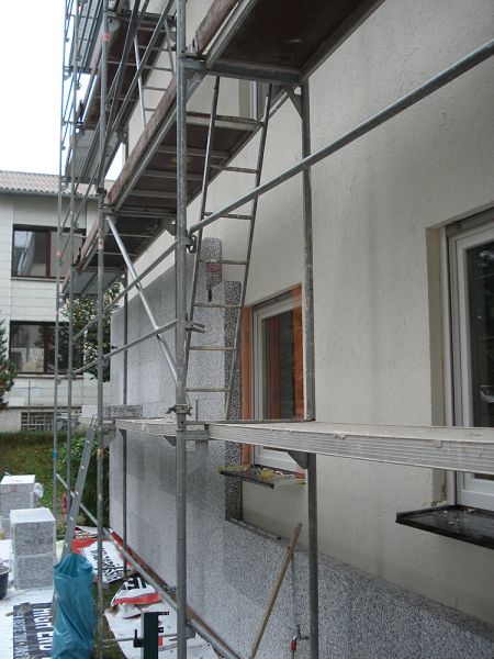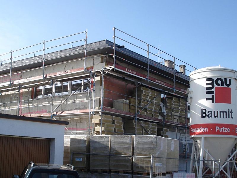 Komplettsanierung von zwei Mehrfamilienhäusern in Gilching. Durch Aufbringen einer Wärmedämmung auf das gesamte Gebäude und Austausch der Fenster mit 3-fachverglasung werden zukünftig über 60% der Wärmeenergie eingespart. Die Maßnahme hat einen Energiepreis des Landratsamts Starnberg für vorbildliches Bauen bekommen.