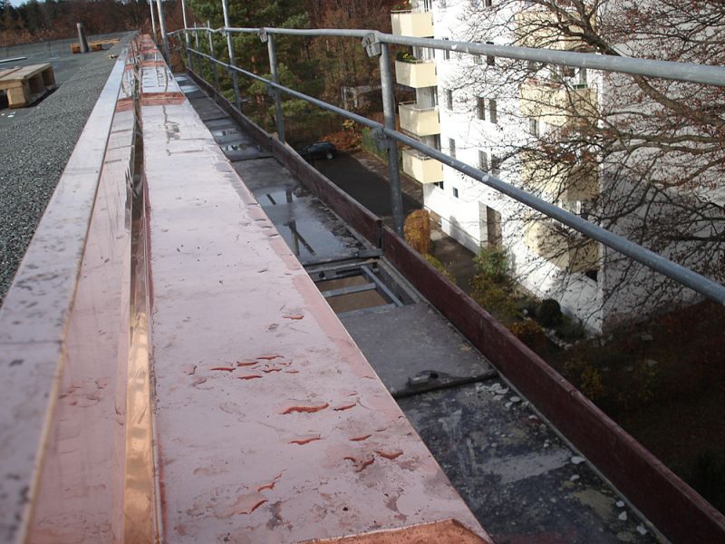 Sanierungsmaßnahme: Entfernen aller Balkonbeläge. Betonsanierung aller Brüstungen und Böden. Neuverblechungen und Neusetzen von Speiern. Ersetzen von seitlichen Edelstahlgeländern durch Geländer und Geländer mit Trespa-Platten.