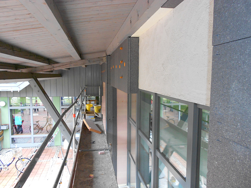 Wärmedämmung der gesamten Fassaden mit 16cm Wärmedämmung, Austausch aller 130 Fenster der beiden Gebäude, 3-fachverglasung U-Wert 0,9, Dämmen der Rollladenkästen, Austausch von Dachflächenfenstern und Haustüren, Notwendige Nebenmaßnahme: Dachüberstands-Verlängerung